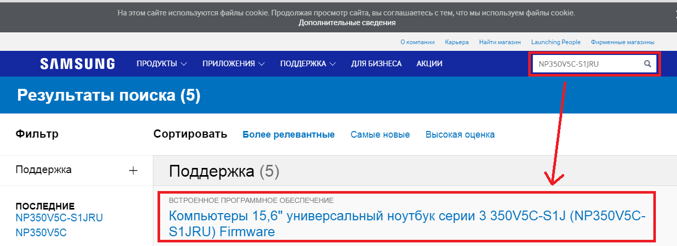 В моем случае, в браузере требуется зайти на сайт Samsung и ввести полное название модели (написано на нижней части корпуса ноутбука): NP350V5C-S1JRU