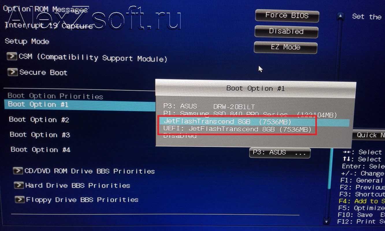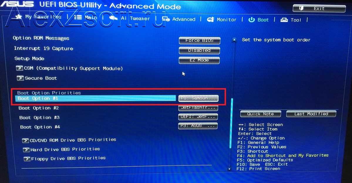 2. Либо перейти в расширенный режим (я всегда пользуюсь именно им), использовав клавишу F7 либо кликнув на надписи «Advanced Mode(F7)». Далее нужно перейти в раздел «Boot» где в параметре «Boot Option #1» (Параметр загрузки #1) выставить требуемую флешку. В конце, по аналогии с предыдущим разделом нужно будет пройти в категорию «Save & Exit» и выполнить сохранение, а затем выход, или просто воспользоваться горячей клавишей F10.