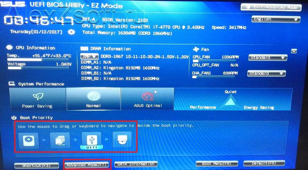 жму и попадаю в UEFI, интерфейс у всех производителей более-менее стандартизирован и построен по одному принципу, сразу после входа в UEFI вы попадаете на информационный экран с общими данными о компьютере и показаниями основных параметров температур, напряжений и т. п. Тут можно сразу пройти в меню Boot Priority и все настроить, но мы пойдем по старинке — ищем способ переключения в расширенный режим, обычно либо есть соответствующая кнопка (на картинке ниже указана стрелкой), либо внизу указана клавиша с помощью которой можно перейти в Advanced Mode в нашем случае F7, жмем: