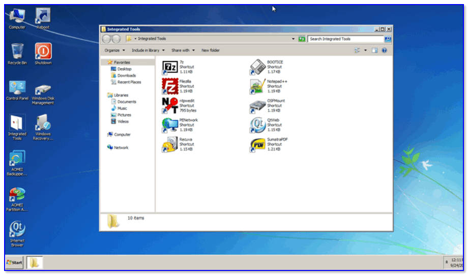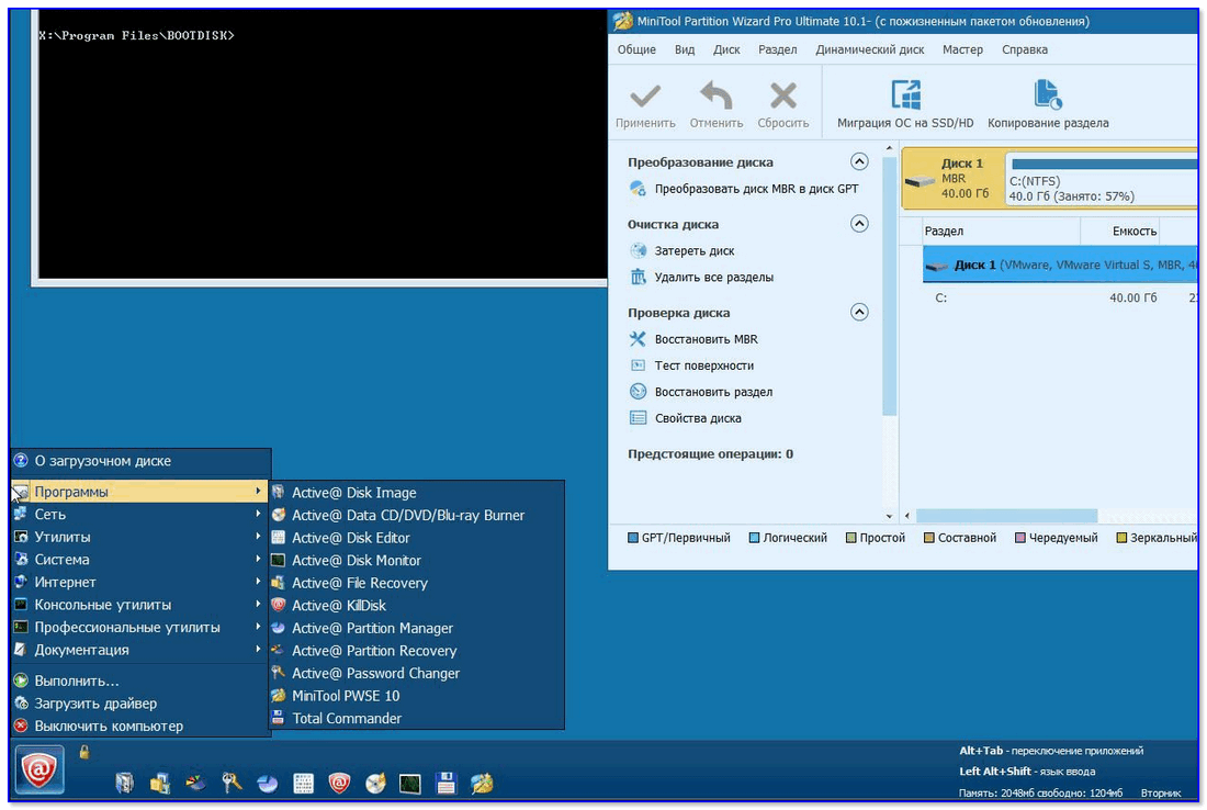Hiren’s BootCD PE – этот диск основан на ОС Windows XP (урезанной версии) с полным комплектом различных программ. Позволяет относительно спокойно пользоваться ПК (в том числе и сетью) просто загрузившись с флешки.