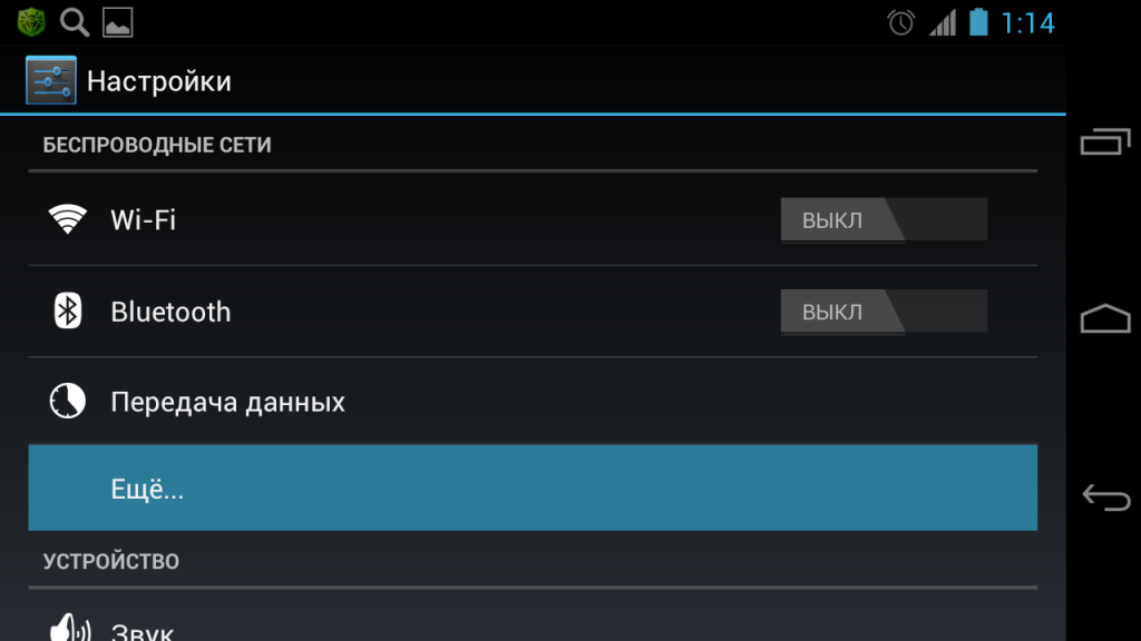 Шаг 1. Заходим в настройки телефона. Нас интересует пункт «Еще» в новой Android ICS. Либо «настройки связи», а также аналоги этой фразы.