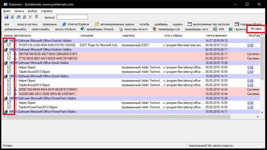 Массовая проверка объектов автозапуска на вирусы в Autoruns