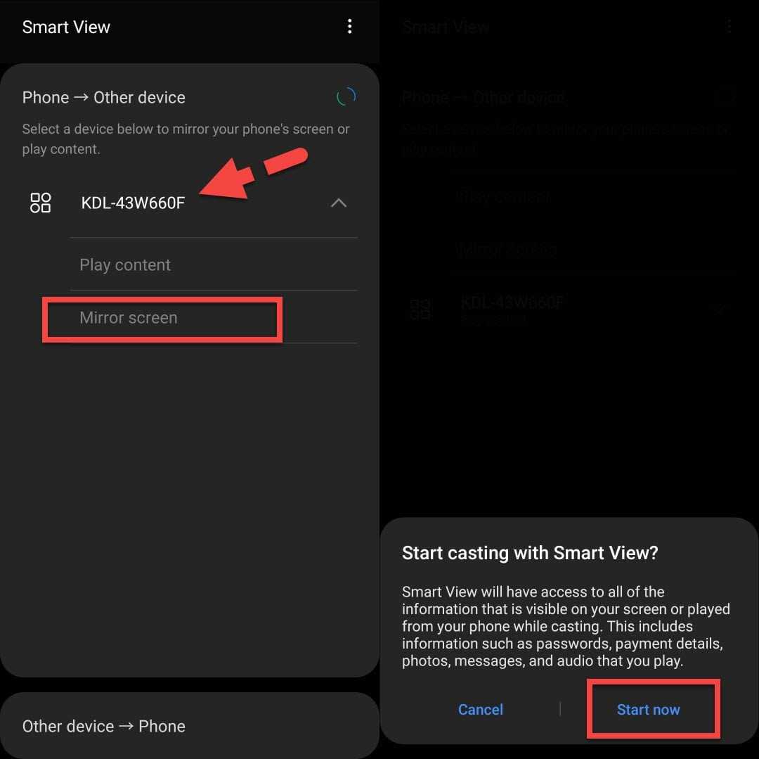 Step 5. Select your TV’s model name and then tap Start now to start the screen sharing process. Bear in mind that, if you are screen mirroring your Galaxy phone to your Sony TV for the first time then you may need to select Allow if you are prompted.