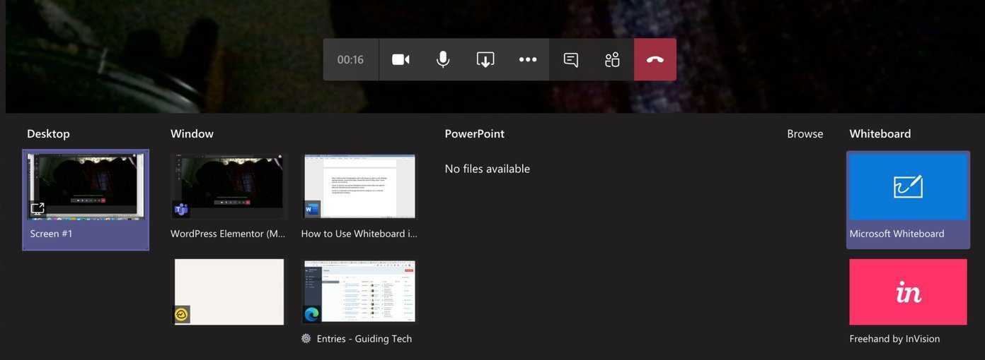 Шаг 5: Выберите вариант совместного использования экрана, и он попросит вас выбрать текущий рабочий стол, открыть окна, слайды PowerPoint, просмотреть файлы с ПК / Mac, другого канала Teams или OneDrive.