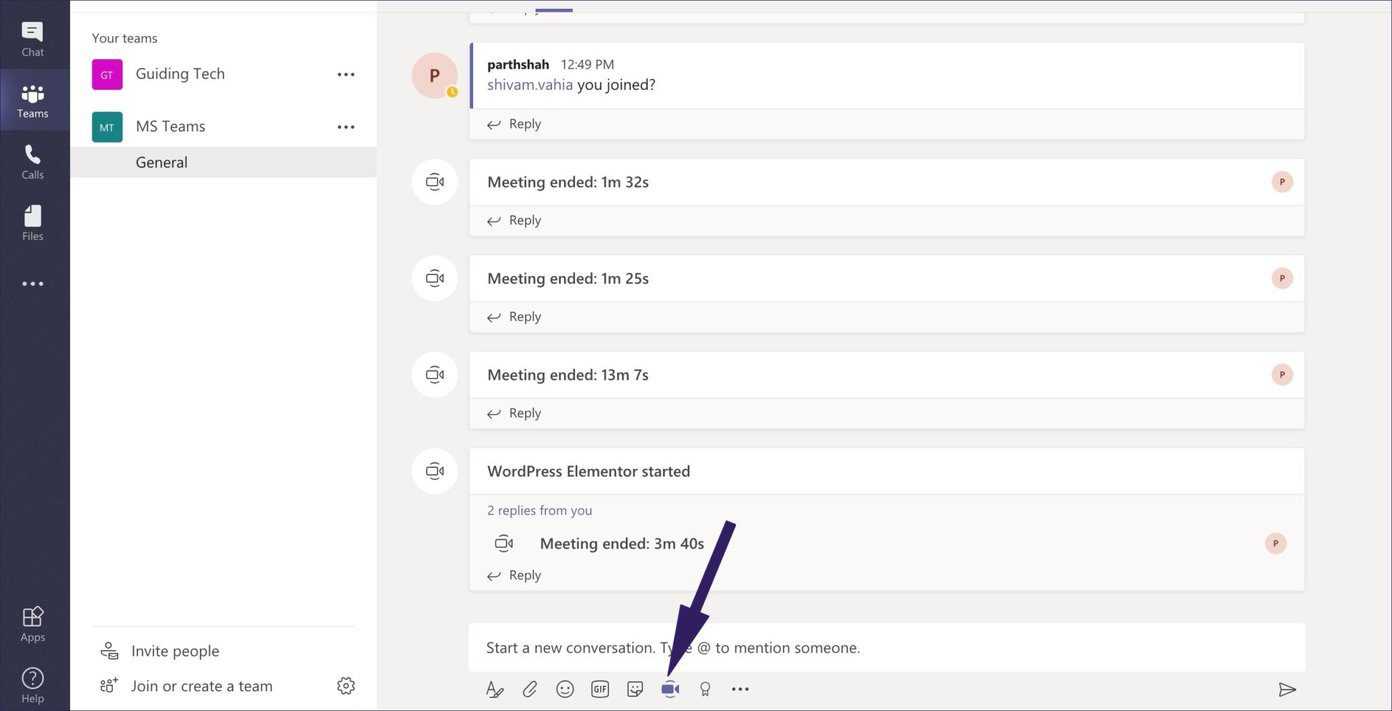 Шаг 3: В нижнем меню канала вы увидите опцию «Встретиться сейчас». Нажмите на нее, и начнется групповой видеозвонок между членами команды. Перед началом видеозвонка вы также можете добавить подходящую тему.