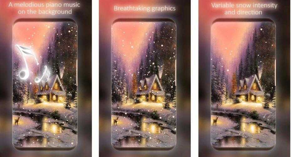 Красивая анимированная заставка с падающими 2D/3D снежинками на фоне новогодних и зимних пейзажей. Приложение экономно расходует батарею и переключается в спящий режим при выключенном экране. Поддерживается работа на планшетах и смартфонах.