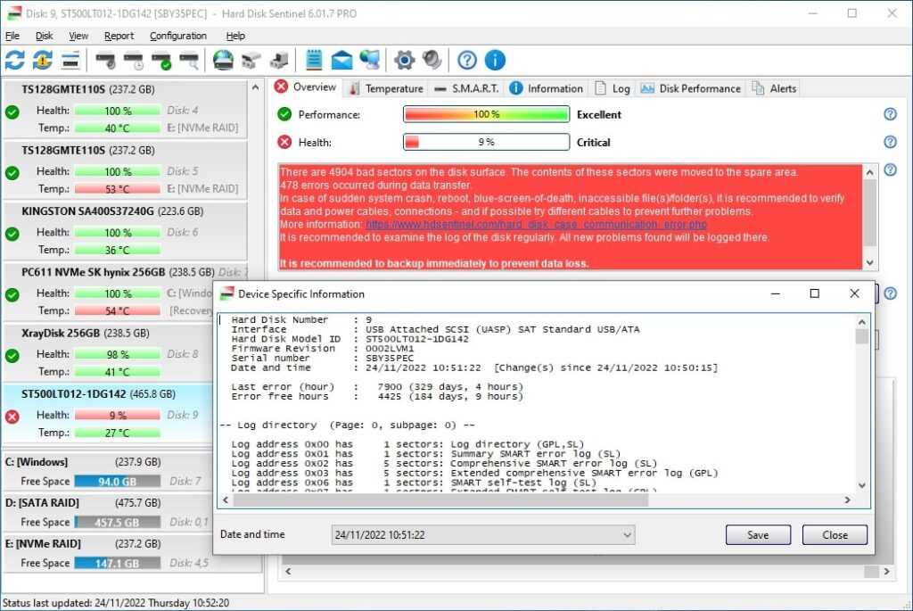 This feature is highly helpful for computer repair technicians. Simply scan the disk using HD Sentinel software to determine the actual problem. The software will list all errors that occurred in the disk from the beginning. The latest error can be highlighted to determine the cause and fix it.