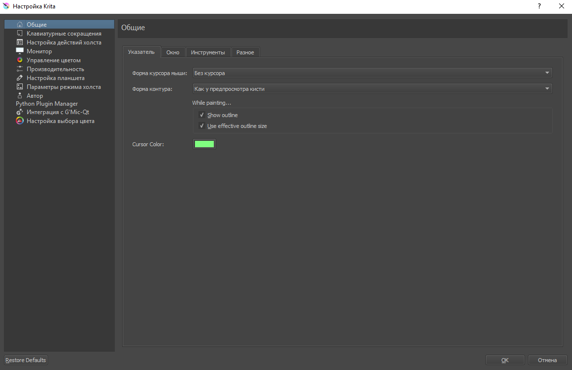 Меню настроек в Krita выглядит следующим образом