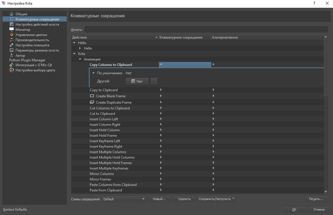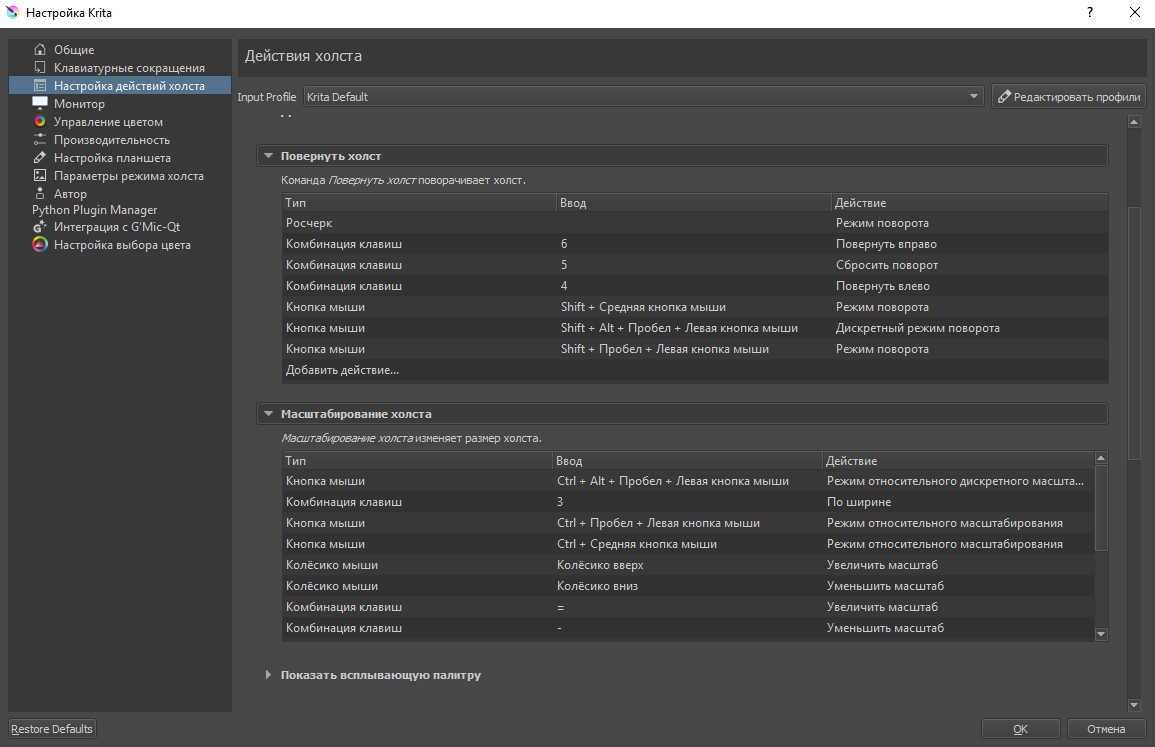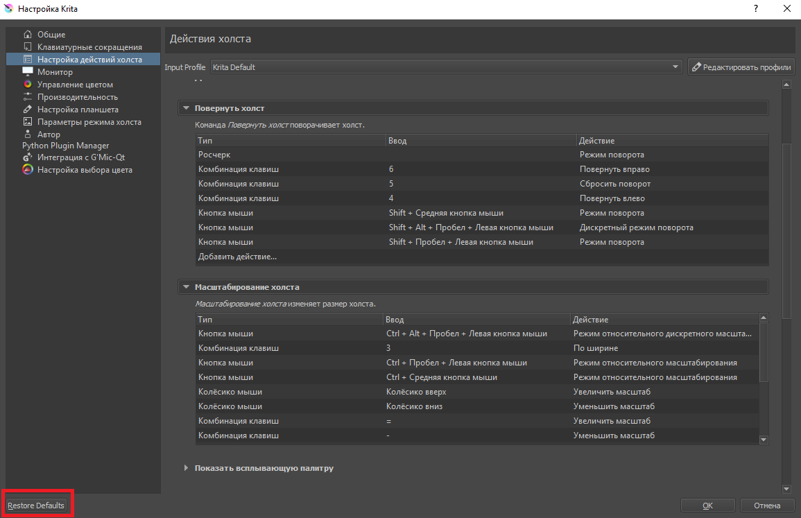 При помощи этого меню вы можете задать свои сочетания горячих клавиш, однако следит за тем, чтобы значения не пересекались. Если в настройках действий холста по умолчанию режим выбора слоя открывается нажатием клавиши R и левой кнопки мыши, то назначить это сочетание для своих нужд вы не сможете, пока не измените стандартные настройки.