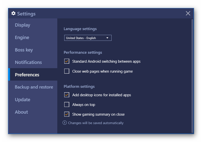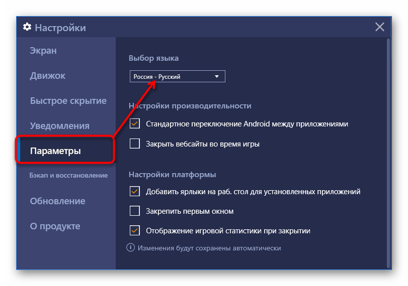 При желании вы можете изменить только язык интерфейса настроек. Сам эмулятор продолжит работать на прежнем языке, и меняется он уже другим путем, об этом написано во втором способе.