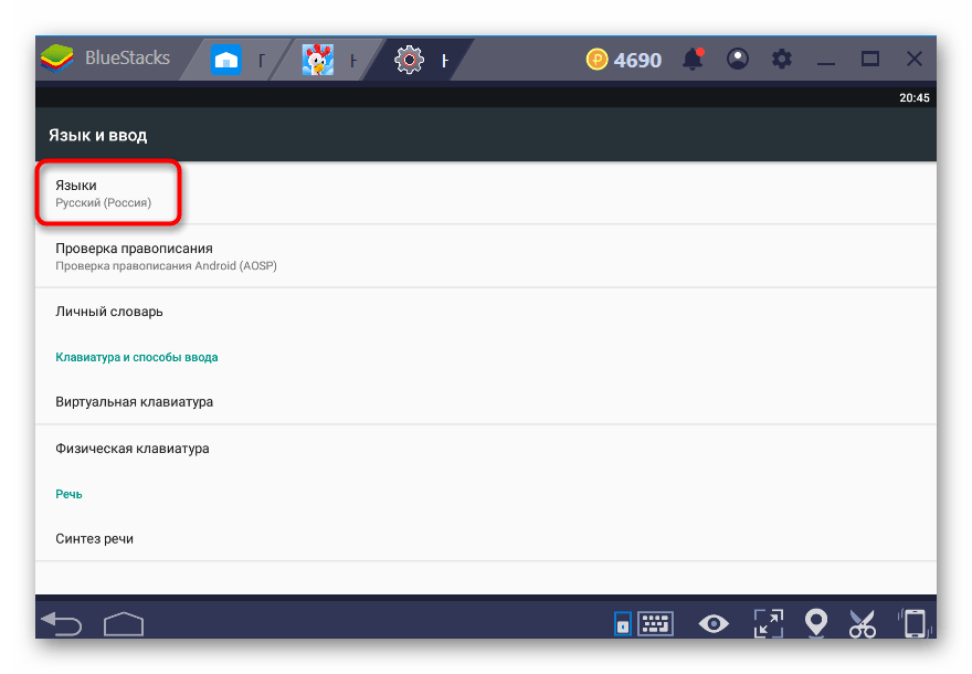 Эта настройка меняет язык не только самого эмулятора, но и внутри Android, на котором он, собственно, и работает. То есть, этот способ включает в себя те, о которых шла речь выше.