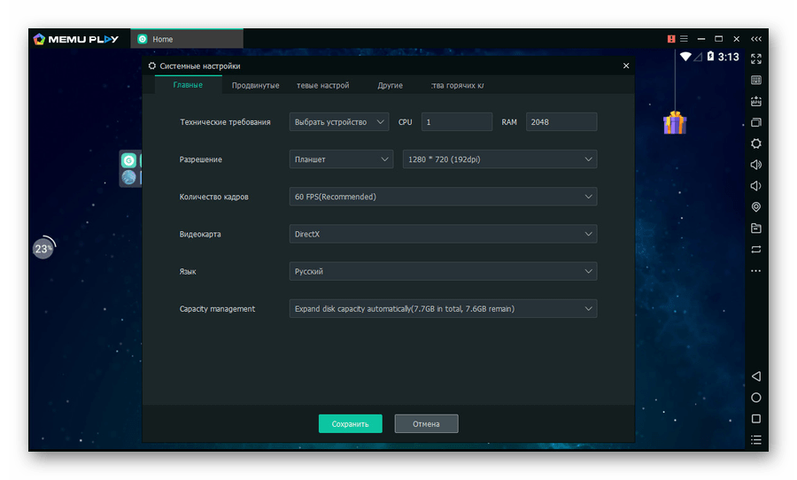 Для комфортной работы эмулятора важно правильно указать системные настройки. К примеру, количество ядер, объем выделяемой оперативной памяти, разрешение экрана и показатель DPI (пикселей на дюйм)