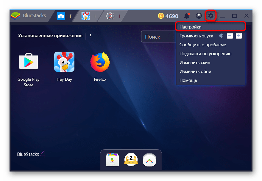 - Откройте BlueStacks, в правом верхнем углу нажмите на иконку с шестеренкой и выберите «Настройки».