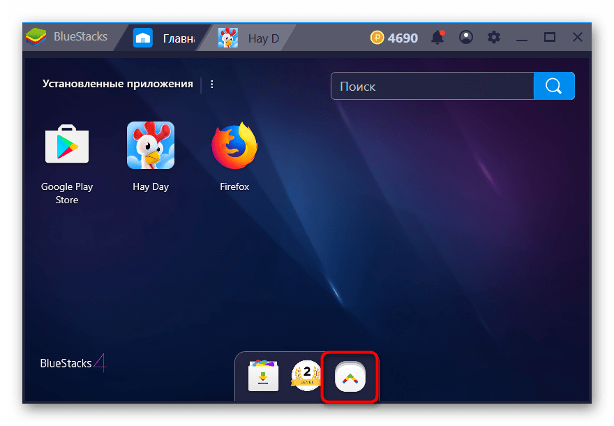 - Запустите BlueStacks, внизу рабочего стола нажмите на иконку «Больше приложений».