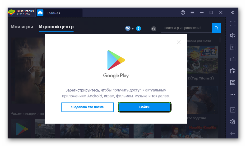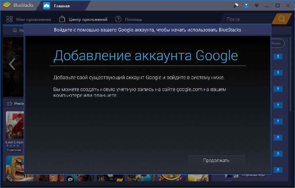 Вход Bluestacks в Google аккаунт