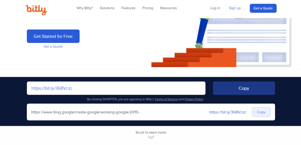 Пример — ссылка без сокращения выглядит как “https://www.blog.google/inside-google/working-google/2019-review-stories-google-year/”, состоит из 85 символов — слишком большая длина. После сокращения эта же ссылка превращается в компактную запись вида “https://bit.ly/368Vczc” — длина всего 22 символа, вчетверго меньше, чем до сокращения.