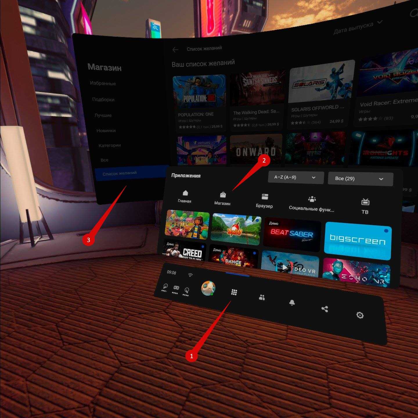 Если всё сделано верно, то при запуске сервера Virtual Desktop на ПК и запуске Virtual Desktop в Квесте вы увидете помимо раб.стола еще и вот такое меню с играми — третья вкладка сверху: