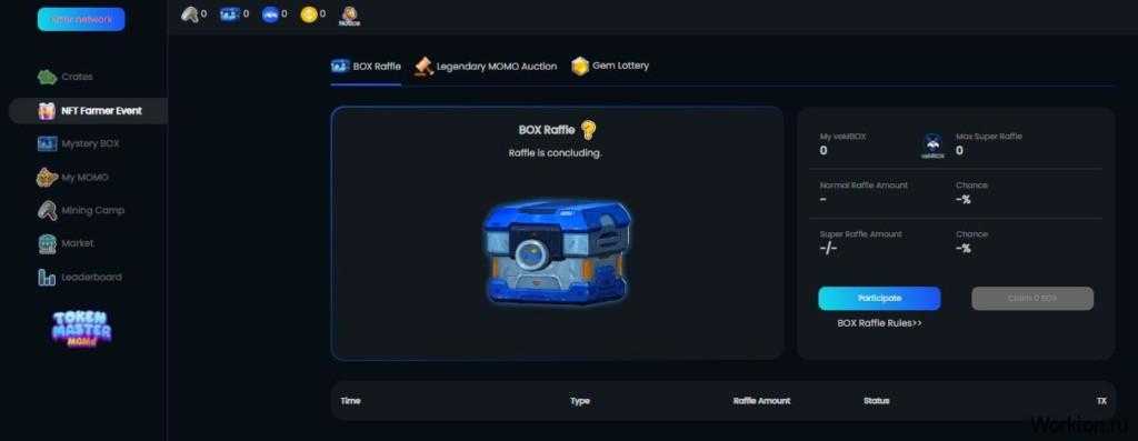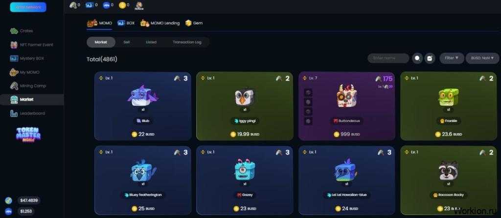 Здесь собраны все ваши персонажи. Они работают в шахте, добывают для вас MBOX на автомате. Стоимость у них разная, а также они делятся на несколько видов — Common, Uncommon, Unique, Rare, Epic и Legendary. В зависимости от типа героя, меняется их базовый показатель добычи, поэтому чем дороже у тебя монстрики, тем больше прибыль.