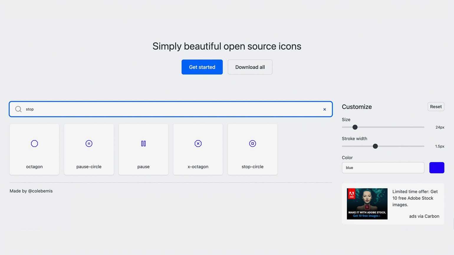 На сайте Feather находится небольшая коллекция контурных иконок. Автор проекта позаботился о веб-дизайнерах и для встраивания этих иконок в сайты, а ещё сделал библиотеку компонентов для Figma.