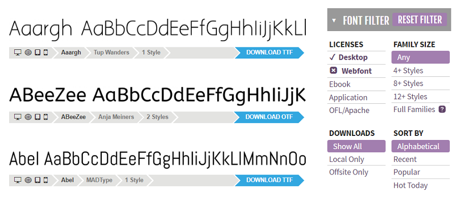 Каталог fontsquirrel: сразу видны форматы и количество стилей, справа – удобный фильтр