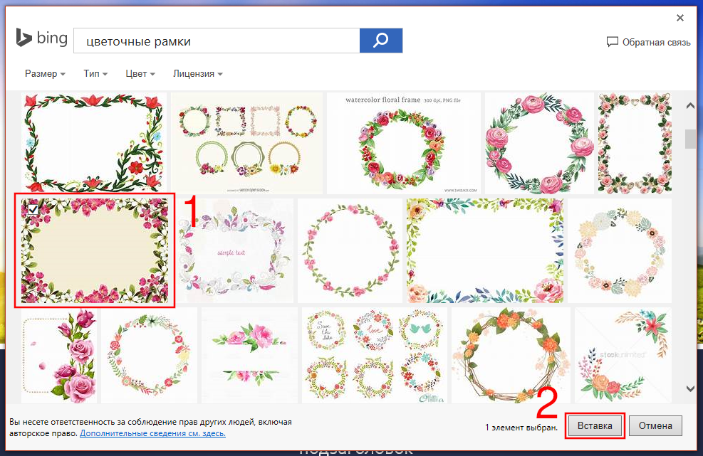 Введите фразу для поиска «рамки» или «цветочные рамки» в поле поиска изображений Bing и кликните кнопку «Поиск» (или нажмите Enter).