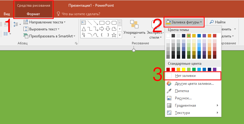 Теперь, когда мы получили правильный размер заготовки, нам хотелось бы устранить фоновый цвет из фигуры. На вкладке «Формат» кликните кнопку «Заливка фигуры» и затем в раскрывающемся меню кликните команду «Нет заливки».