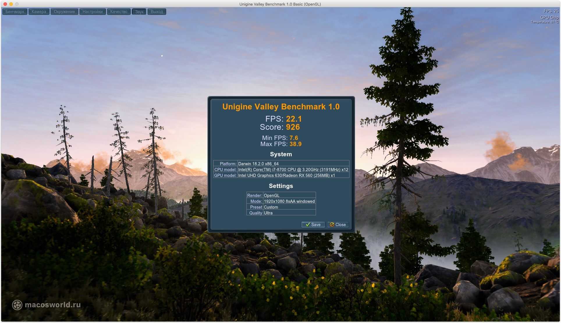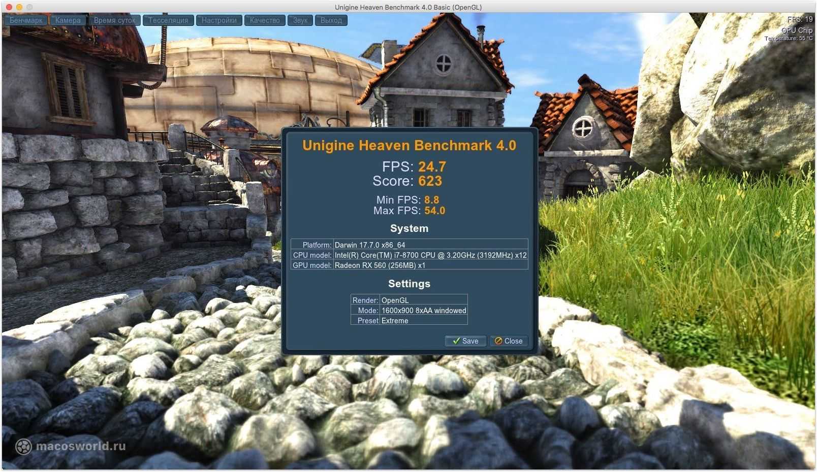 Два теста графической подсистемы, которые не просто делают расчеты, а уже показывают какую-то визуализацию, а-ля игру. Бенчмарки относительно старенькие: 2009 и 2013 год. Но все еще пользуются популярностью ввиду отсутствия альтернатив под macOS.