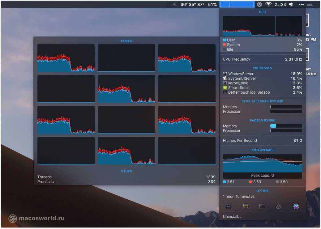 График изменение температуры видеоядра в iStat Menus Нагрузка на процессор по потокам