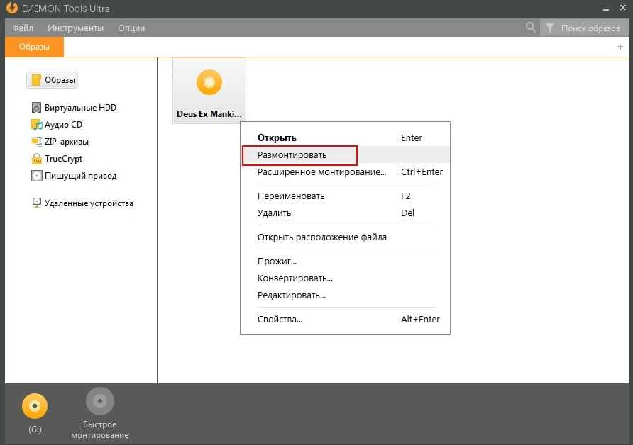 Важно! Для того чтобы деактивировать оптический диск, нужно запустить утилиту Daemon Tools, найти папку с игрой, вызвать всплывающее меню и активировать команду «Размонтировать». Отключить условный дисковод удастся из окошка «Этот компьютер»