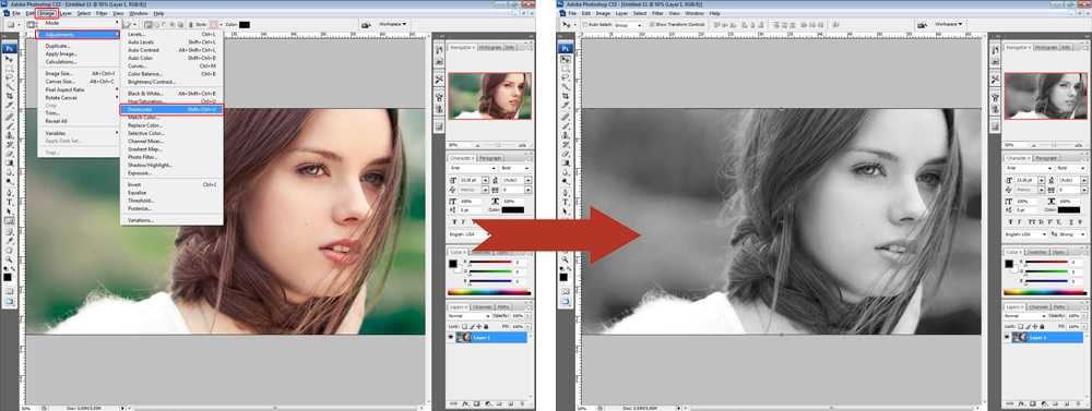 Можно воспользоваться другим несложным приёмом в Фотошопе. Он также выполняется быстро и легко. В том же разделе Image немного ниже расположена функция Adjustments (Коррекция), в списке выбирайте Desaturate (Обесцветить). Можно эту операцию выполнить сочетанием клавиш Shift+Ctrl+U.