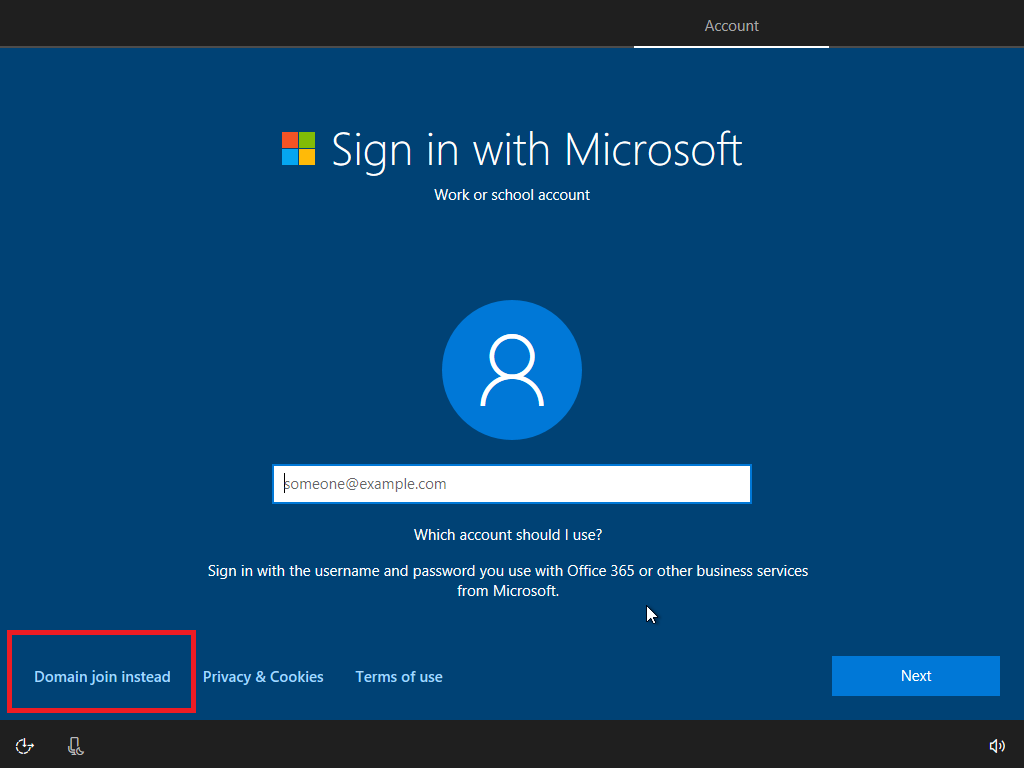 Step 11: Don’t sign in with Microsoft account because we are going to create a vulnerable machine so click on Domain joins instead.