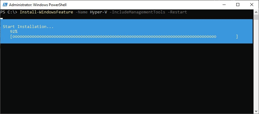 We can also install Hyper-V on a Windows server with PowerShell. Make sure that you have opened PowerShell with admin privileges (elevated) and run the following command to install the Hyper-V role and management tools:
