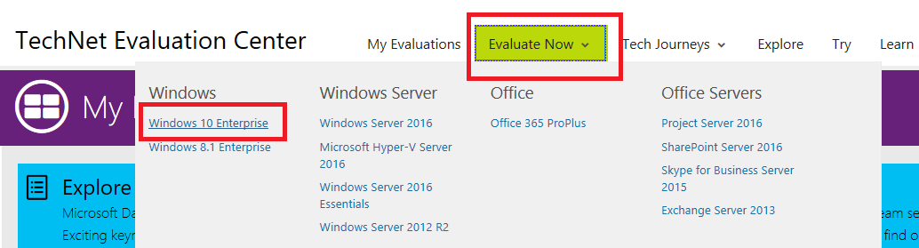 Step 1: Click on Evaluate now > Windows 10 Enterprise,
