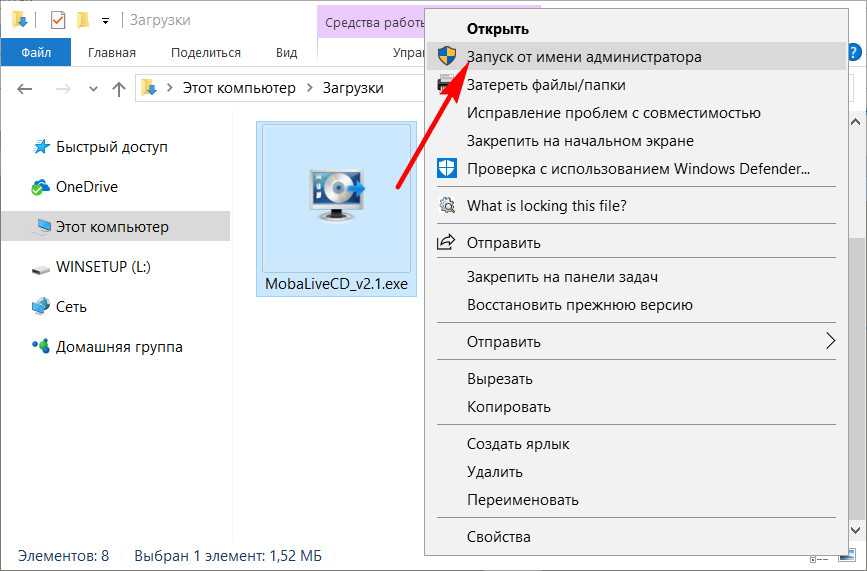 Отмечу, что в установке MobaliveCD не нуждается, но запустить ее нужно от имени администратора (для этого достаточно кликнуть по загруженному файлу правой кнопкой мышки. См. скрин ниже).