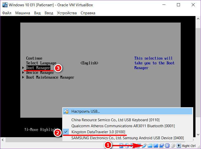 В окне активной EFI-машины этого гипервизора сначала подсоединяем флешку.