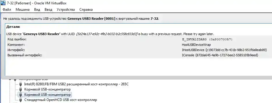 Если в верхней части экрана VirtualBox при попытке пристегнуть флешку постоянно появляется сообщение на английском с окончанием usb device is busy with previous request, решение ошибки может лежать в части валидности самой программы. И здесь вариантов немного, хотя симптомов фоне ошибки море. Если usb device is busy with previous request появляется при подключении любой из флешек, проверьте Диспетчер устройств хозяйской машины.