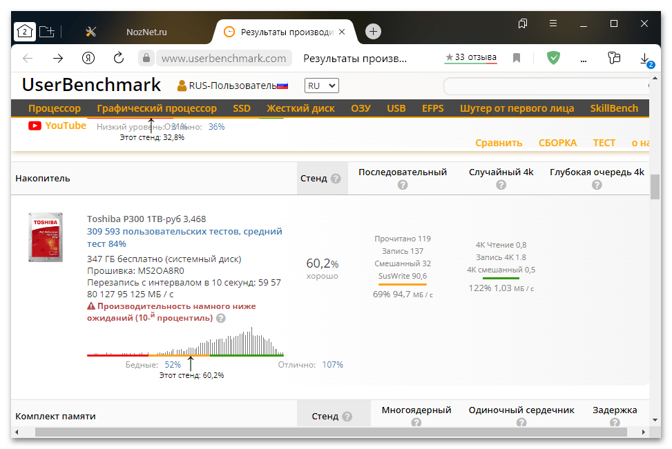 Есть возможность получить и более подробные данные о тестировании жесткого диска – средний и максимальный балл, полученный во время проверки, сильные, слабые стороны, недостатки запоминающего устройства и прочее. Кстати, на сайте есть информация о том, какие шаги предпринять для повышения скорости работы компьютера, а если захотите заменить все или часть оборудования, то User Benchmark предложит огромный список комплектующих, которые можно сортировать по разным параметрам, сравнивать со своими компонентами, а также загружать в удобный конструктор, чтобы проводить виртуальное тестирование ваших новых сборок и получать полезные рекомендации.