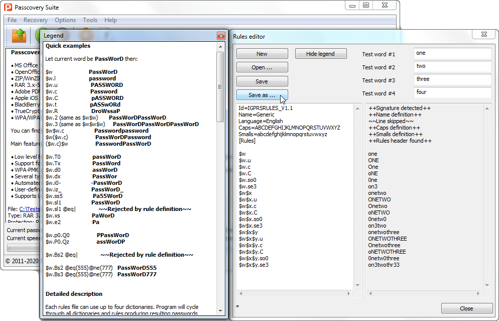 | Passcovery Suite for Microsoft Office/LibreOffice/OpenOffice, Adobe PDF, Zip/WinZip, Rar/WinRar, TrueCrypt, Apple iOS, BlackBerry OS, WPA/WPA2 (GPU-accelerated) |