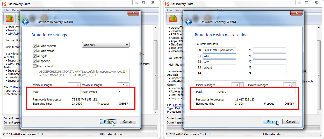 Например, если известно, что начинаться пароль будет с заглавных согласных, то нет смысла проверять пароли с другими буквами в первой позиции. Далее идут строго строчные гласные. Отлично, «выпиливаем» из набора все остальные символы. А на конце либо цифра, либо спецсимвол. Оставляем только их. И в результате, вместо 75+ триллионов паролей на проверку осталось 11+ миллиардов. А время полного перебора сократилось с почти трёх лет до 3 (трёх) с лишним часов часов.