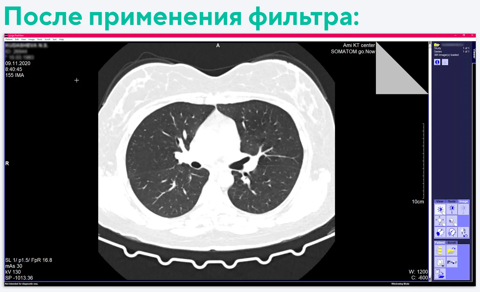 В программе есть предустановки яркости и контрастности — режим «Windowing» в них настроен так, чтобы без дополнительных манипуляций можно было лучше увидеть ткани легких, костей, мозга и т.д.
