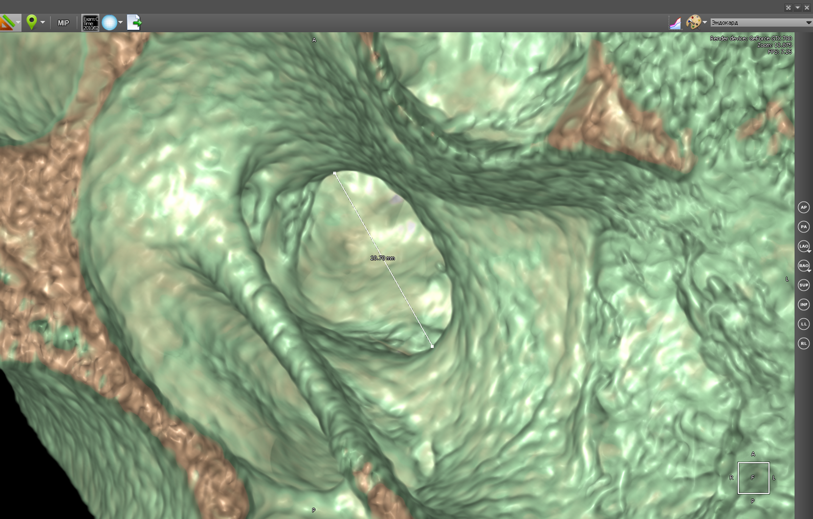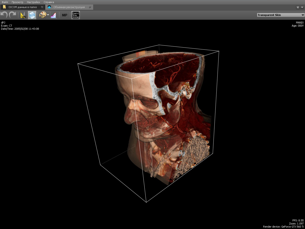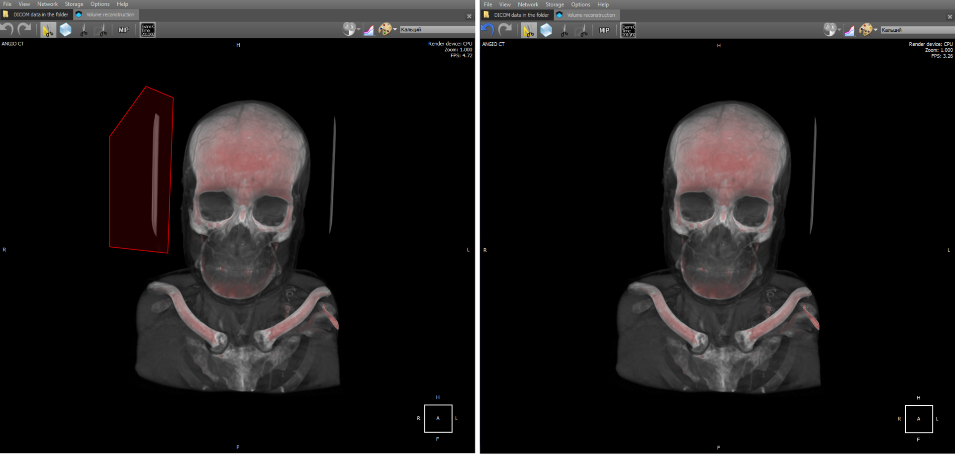 Инструмент Clipping Box позволяет увидеть кости и анатомические ткани в разрезе, а также показать внутренние органы изнутри. Инструмент реализуется на уровне рендера, просто ограничивая область рейтрейсинга.