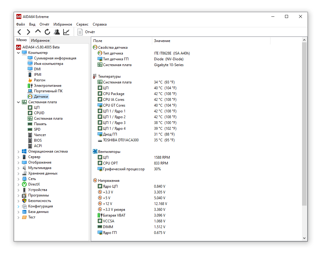 Это настоящий швейцарский нож для работы с компьютерным «железом». Всего доступны для считывания более 250 различных датчиков. Если вы просто хотите проверить температуру компьютера, то можно обойтись приложениями попроще, но если вам нужна более комплексная информация — AIDA64 незаменима.