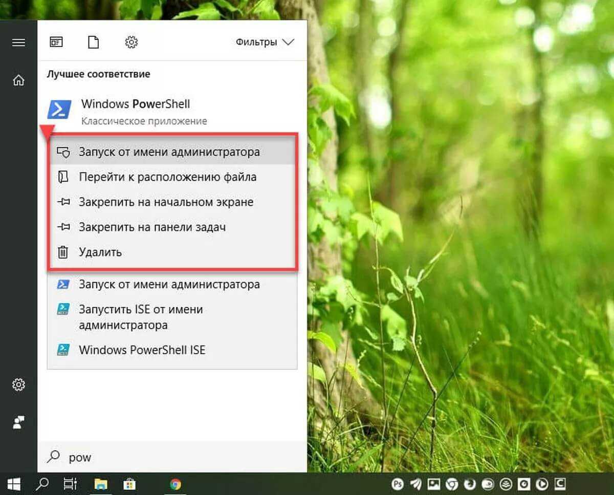 - Запустить приложение. Для этого нажать ЛКМ по кнопке «Пуск» и ввести в появившемся поле поиска «PowerShell». После обнаружения программы кликнуть ПКМ по иконке в строчке поиска и запустить приложение с правами администратора.