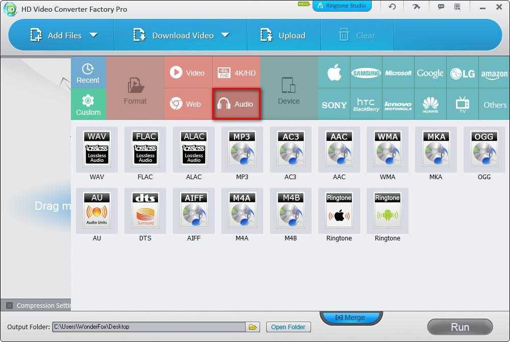 Поддерживаемые форматы выходного аудио: MP3, WAV, FLAC, ALAC, DTS, M4A, AC3, AAC, WMA, OGG, APE, MKA, AU, AIFF, FLAC, M4B, M4R, MP2, MPA и т. Д.