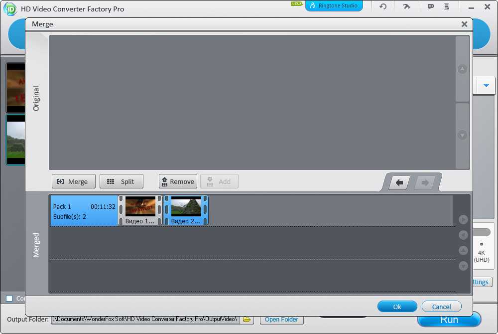 Если нужно объединить два видеофайла, жмем «Merge», в открывшемся окне нажимаем кнопку с тем же названием и добавляем в единый ряд оба файла из верхней области окна. После нажатия «OK» файлы будут подготовлены к слиянию, а вам останется лишь выбрать подходящий формат. Тип файла или устройство выбираются нажатием значка текущего формата в меню «Output Format». При этом справа выезжает панель с иконками доступных шаблонов конвертирования, ежели еще нажать кнопку «Settings», то можно будет отредактировать параметры выбранного пресета.