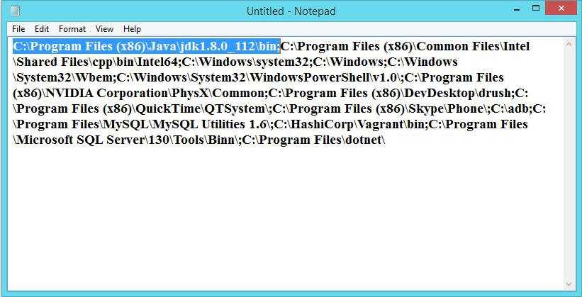 Если нет, то вставьте скопированное ранее место установки в начало переменной и добавьте в конце строки bin вот так: C:Program Files (x86)Javajdk1.8.0_112bin; Обратите внимание, что ваша версия JDK (jdk1.8.0_112) может отличаться. Скопируйте значение переменной и вставьте его в окошко PATH
