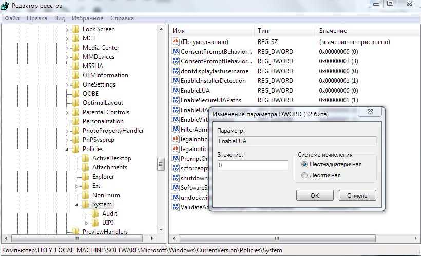 Разыскав ветку «HKEY_LOCAL_MACHINE/SOFTWARE/Microsoft/Windows/CurrentVersion/Policies/System», переходят в строку «EnableLUA» и вместо 1 пишут здесь 0.