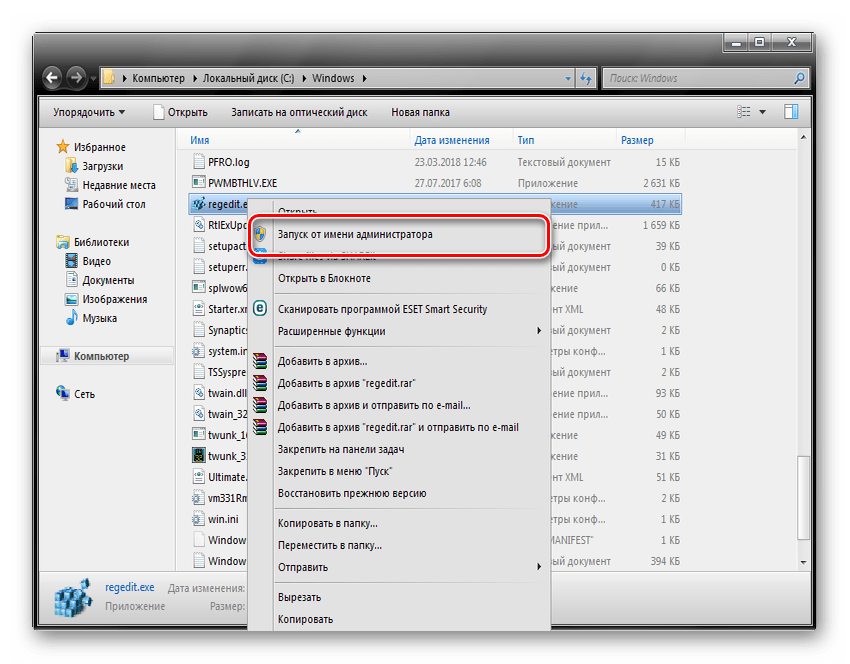 Теперь «Проводник» без проблем сможет отображать системные каталоги и их содержимое. Можно приступать к поиску исполняемого файла редактора реестра.