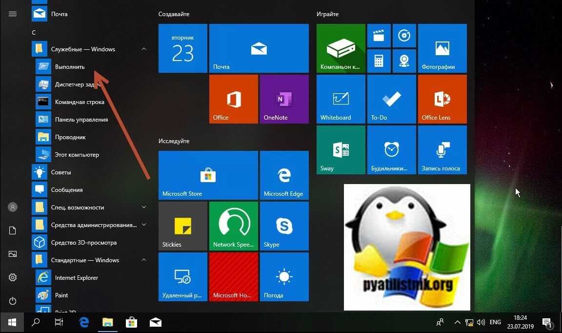 Активировать «Выполнить» можно через меню «Пуск».