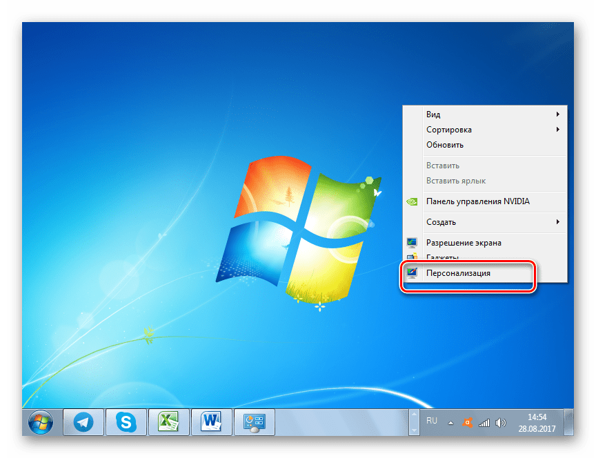 - Кликните ПКМ по «Рабочему столу». В раскрывшемся списке выберите «Персонализация».